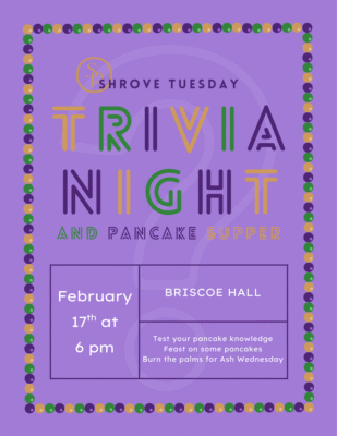 Put your pancake knowledge to the test at St. Philip’s Shrove Tuesday Trivia Night and Pancake Supper! Sure to be a fun night indulging in pancakes, teasing your brain (and maybe competing for prizes), and burning the palms for the ashes we will receive on Wednesday. We hope to see you and your family there!