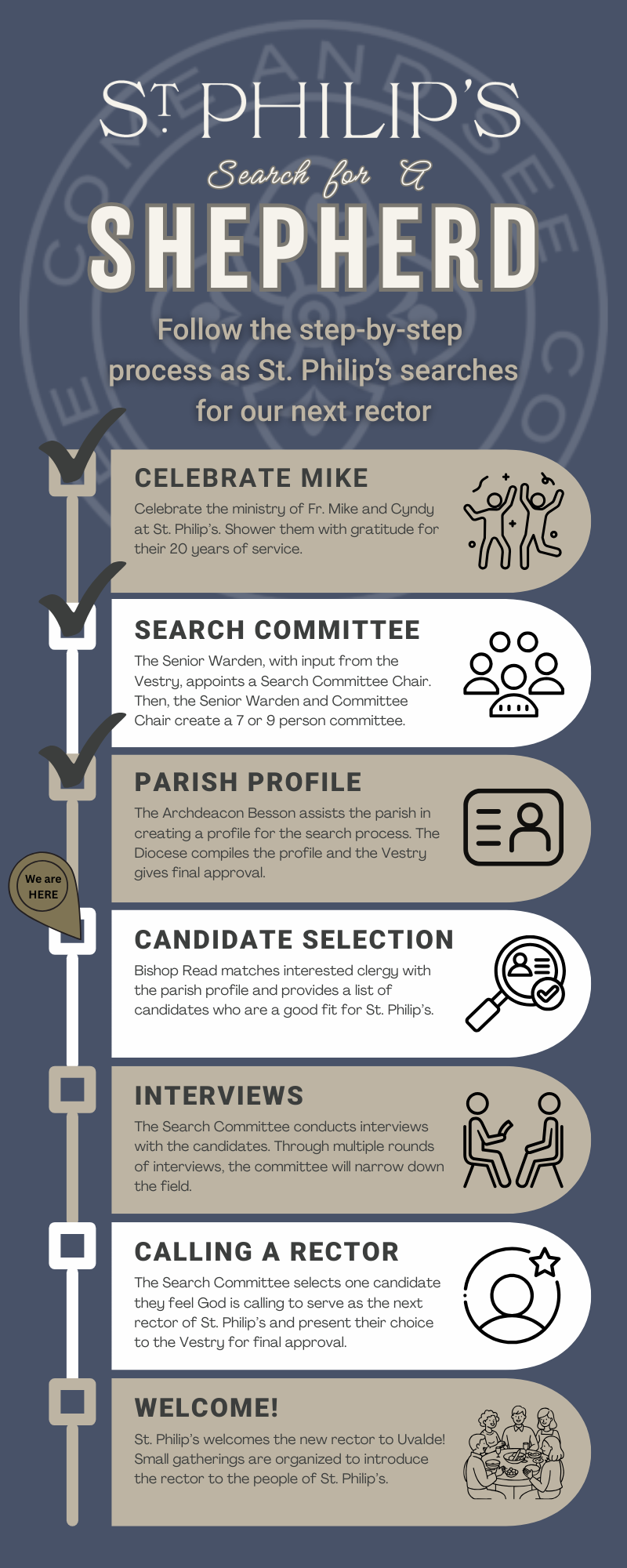 It’s been a while since we’ve gone through the process of searching for a new rector here at St. Philip’s, and many may be unfamiliar with how this process works in the Episcopal Church. We want to keep the congregation updated on what the interim period will look like as we say goodbye to Fr. Mike and begin to imagine what God has in store for us in our next rector.