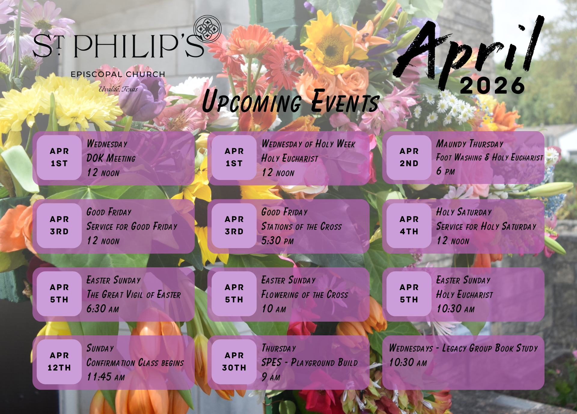 Help us decorate the altar for Easter by contributing to the Easter Flower Fund. Dedications can be made in honor of a person or occasion, in memory of loved ones…